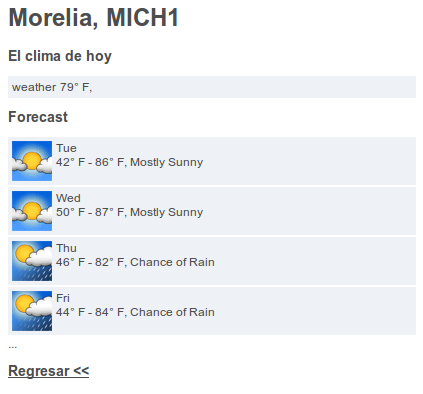 Hace rato que tenia un tiempo libre me puse a ver lo que se podia hacer e hice un pequeño ejemplo, un formulario donde escribes el nombre de una ciudad, Ej. Guadalajara, Morelia, Queretaro y haciendo uso de Google Weather te muestra el clima de hoy así como el clima de los siguientes 4 días :), la verdad es muy fácil de usar, a continuación les dejo el código.