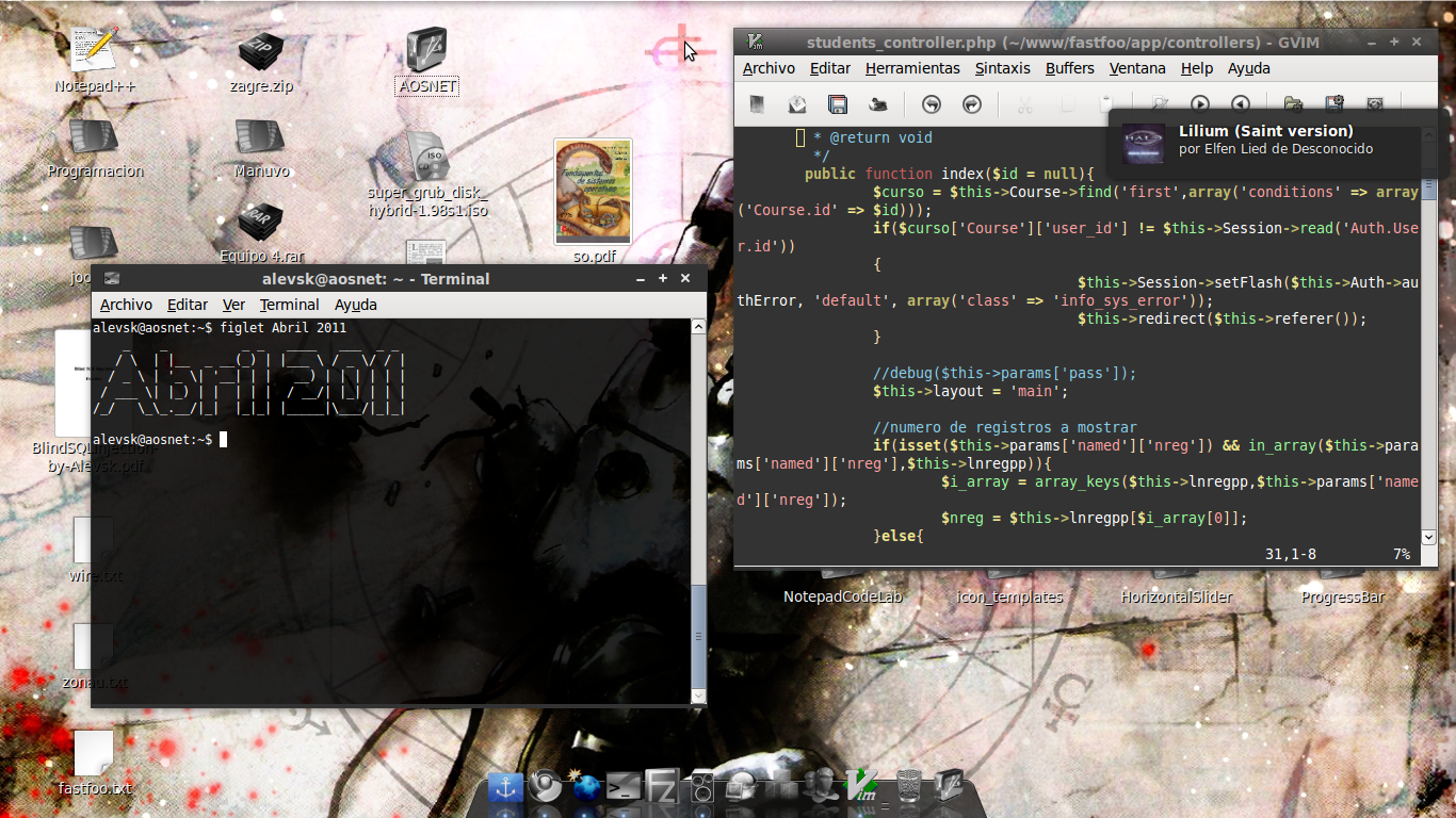 Quiero retomar una costumbre que tenia en mi antiguo blog Alevsk-Zone, consistía en mostrar la apariencia de mi escritorio (Linux) cada mes e ir modificándolo para que fuera diferente el mes que siguiera, de la misma manera los lectores podían sacar capturas de pantalla de los suyos (windows, linux, mac, etc.), enviármelos y yo publicarlos en las entradas :), ¿que dicen?, ¿se animan xD?