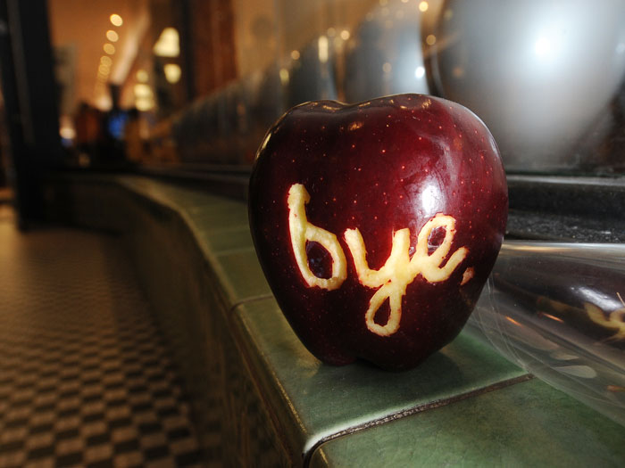 Notas adhesivas en la ventana de una tienda Ishop, escritas por fans de apple