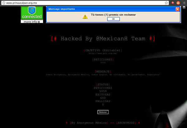 Seguimos con las ciber protestas, además de inflar y contrarrestar tendencias en twitter la gente de “Anonymous" se dio a la tarea de tirar sitios del PRI (¿Como si supieran hacer algo mas verdad?), rápidamente sacar sus botnets y apuntaron su LOIC hacia dominios como http://www.pri.org.mx/ y http://www.prinaucalpan.org.mx/, si se apuran aun pueden ver los sitios fuera de servicio, ahora va mi opinión respecto a estos actos, en lo que a mi respecta DDOSEAR una pagina es exactamente lo mismo a tomar reforma por ejemplo, es una pendejada!, dejas de DDOSEAR y ¿luego que?, pero bueno, es lo que estos changuitos saben hacer mejor :D, en lo personas, lo digo por que varias personas me conocen y no es ningún secreto, si yo tuviera una botnet (y no digo que la tengo, aqui no somos pendejos xD) yo la utilizaría / aprovecharía para sacar beneficios personales #IfYouKnowWhatImean y no estar buscando los reflectores :).