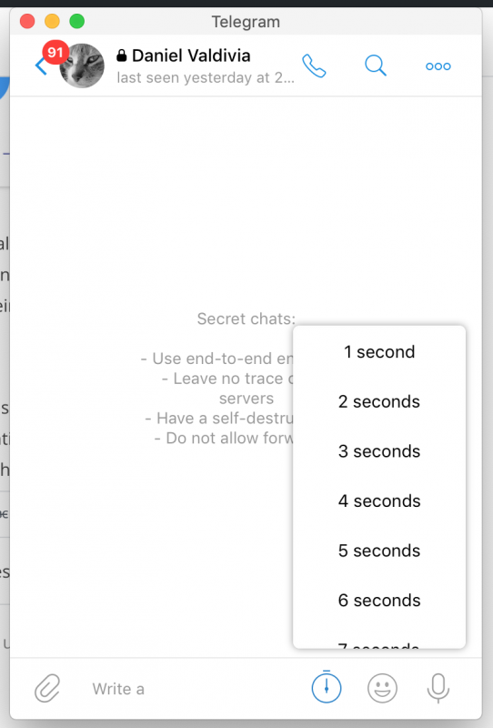 Another cool feature is self-destruct messages, basically you can set a timer so messages only exists during a particular amount of time after being send and then are destroyed, very useful when you want to share sensitive data such as passwords.