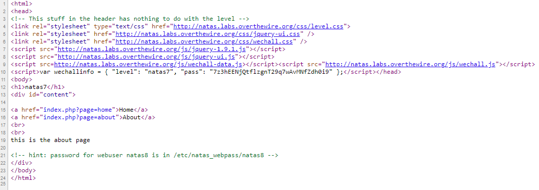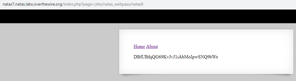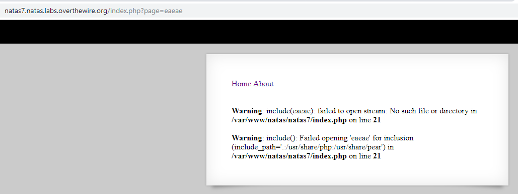 Efectivamente podemos ver la ruta del archivo php en el servidor (path disclosure), debido a esta vulnerabilidad podemos leer cualquier archivo al que el usuario que ejecuta el servidor web tenga acceso, por ahora solo nos centraremos en obtener la bandera del reto con http://natas7.natas.labs.overthewire.org/index.php?page=/etc/natas_webpass/natas8